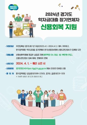 [한국뉴스타임=편집국] 경기도가 4월 1일부터 ‘2024년 학자금대출 장기연체자 신용회복 지원’ 신청접수를 시작한다.