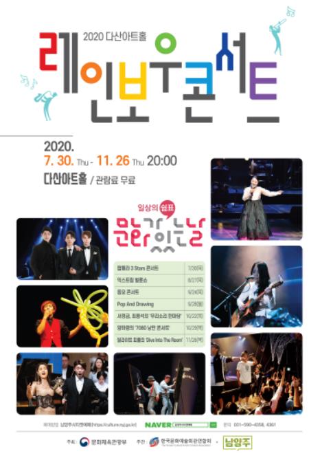 남양주시(시장 조광한)는 7월 30일(목)부터 11월 26일(목)까지 매달 문화가 있는 날을 맞이해 다산아트홀(다산중앙로 7)에서 레인보우 콘서트를 운영한다.
