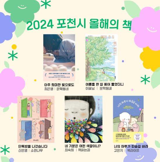 포천시가 선정한 올해의 책은 ▲일반도서 부문 최은영 작가의 '아주 희미한 빛으로도' ▲ 청소년도서 부문 이꽃님 작가의 '여름을 한 입 베어 물었더니' ▲아동도서(초등고) 부문 신은영 작가의 '단톡방을 나갔습니다' ▲아동도서(초등저) 부문 최숙희 작가의 '네 기분은 어떤 색깔이니?' ▲포천작가도서 부문 고은지 작가의 '너의 하루가 따숩길 바라' 등이다.