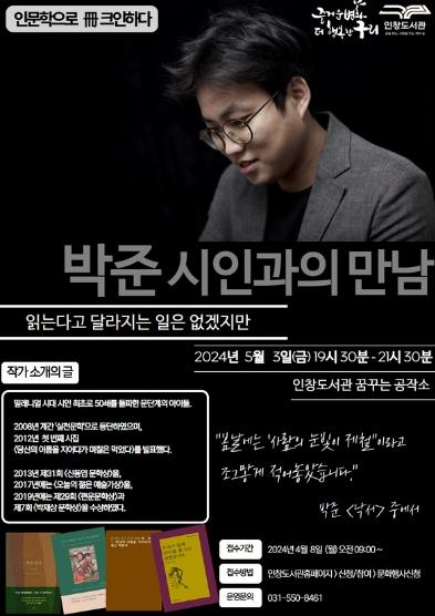 [한국뉴스타임=편집국] 구리시 인창도서관은 오는 5월 3일 오후 7시 30분 '박준 시인과의 만남 : 읽는다고 달라지는 일은 없겠지만' 인문학 프로그램을 운영한다.