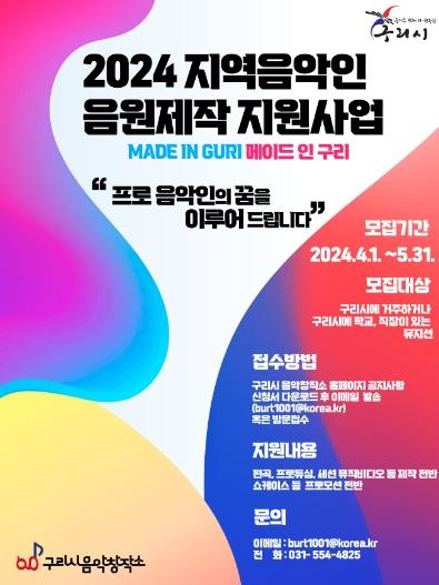 ‘Made in Guri’는 지역 음악인들의 음반산업 진출과 전문 음악인으로서의 자립 역량을 마련할 수 있도록 지원하는 사업으로, 2022년부터 시작해 올해 세 번째로 추진된다.