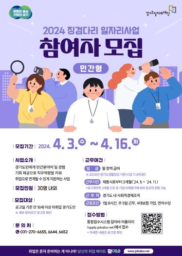 [한국뉴스타임=편집국] 경기도와 경기도일자리재단이 사회적경제조직 등에서 직무관련 경험도 쌓고 정규직 전환으로 이어질 수 있도록 지원하는 ‘2024년 징검다리 일자리사업’의 민간형 참여자를 모집한다.