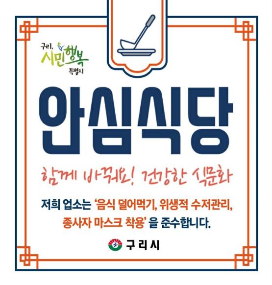 안승남 구리시장은 “코로나19 장기화로 인해 새로운 음식문화 정착을 위한 식당들의 선제적이고 적극적인 동참이 필요한 엄중한 시기에 상시 마스크를 착용할 수 없는 음식점에 대해서는 건강상태질문서(전자출입명부) 작성관리 이행을 강조해왔다”며 “이에 적극적인 협조로 코로나19 확산방지에 최선을 다해 주신 영업주 및 이용자님께 감사와 더불어 시민들께서도 ‘구리 방역 안심식당’을 안심하고 이용하시어 지역경제 활성화에도 동참해 달라”고 전했다.