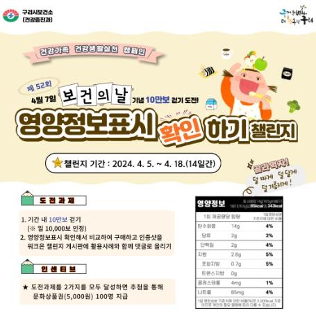 [한국뉴스타임=편집국] 구리시는 제52회 '보건의 날(4.7.)'을 맞아 4월 5일부터 4월 18일까지 ‘영양정보표시 확인하기 챌린지’를 운영한다.