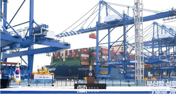 대통령은 그간 부산항이 세계 7위의 수출입 항만이자 세계 2위의 환적항만으로 대한민국의 수출 경제를 이끌어왔으나 친환경 선대, 녹색 해운항로 확대 요구 등 우리 앞에 또 다른 변화와 도전이 기다리고 있어 부산항의 경쟁력을 지금보다 훨씬 더 키워야 한다고 말했다.