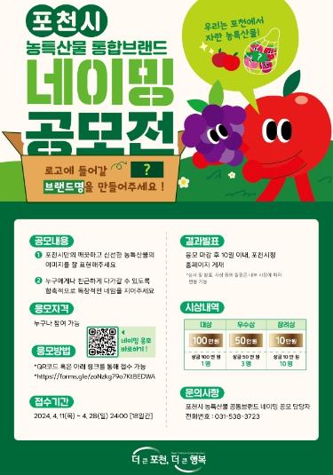 [한국뉴스타임=편집국] 포천시는 오는 28일까지 포천시의 고유한 지역 특성과 정체성이 반영된 농특산물 통합브랜드의 이름을 찾기 위해 전국민을 대상으로 이름 짓기 공모(네이밍 공모)를 진행한다.