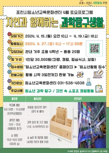 [한국뉴스타임=편집국] 포천시는 오는 15일부터 19일까지 자연과 과학을 주제로 한 청소년교육문화센터 토요프로그램 ‘자연과 함께하는 과학 탐구생활’ 참가 청소년을 모집한다.