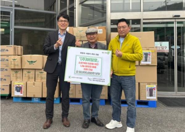 [한국뉴스타임=편집국] 남양주시 진접읍 소재 비에프엘버팔로그룹은 지난 11일 남양주시복지재단과 희망케어센터가 함께하는 다?잇?소 통합바자회를 위해 상?하의 등 의류 5000만원과 ?타올 100만원 상당을 남양주시사회복지관 북부희망케어센터에 전달했다.