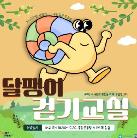 [한국뉴스타임=편집국] 포천시는 오는 4월 16일부터 10월 29일까지 매주 화요일 16시 30분부터 17시 20분까지 군내면 종합운동장 보조트랙 집결지에서 달팽이 걷기운동 교실을 실시한다.