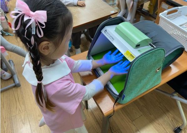 뷰박스는 형광로션을 바르고 손씻기 전후를 비교해 세균이 얼마나 제거됐는지 직접 눈으로 확인할 수 있어 올바른 손씻기 습관 교육에 효과적으로 활용되고 있다.