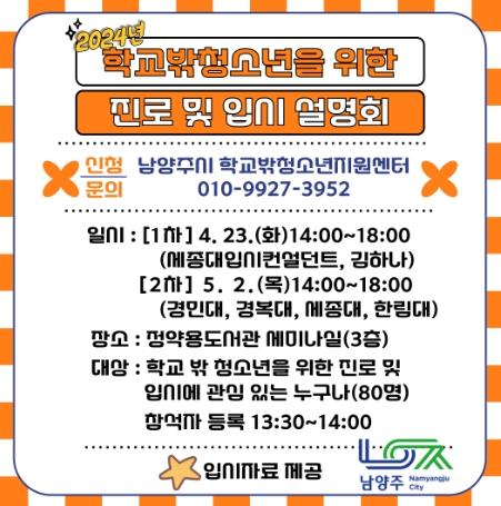 [한국뉴스타임=편집국] 남양주시에서 운영하는 꿈드림센터(학교밖청소년지원센터)는 오는 4월 23일과 5월 2일 오후 2시부터 정약용도서관 세미나실에서 ‘2024년 학교 밖 청소년을 위한 진로 및 입시 설명회’를 개최한다.