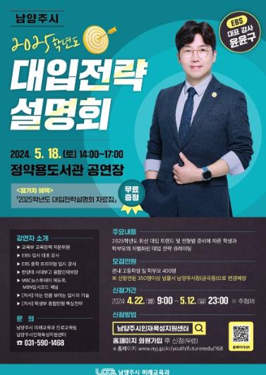 공교육 입시전문성을 대표하는 EBS 대표강사 윤윤구 강사가 초청되어 주요 대입 전형 정보를 남양주시 맞춤형으로 제공하며, 2025학년도 이후 변화하는 대입 최신 트렌드 정보와 전형별 전략 등 대입 경쟁력을 강화하는 방법에 대해 강연하여 학생들의 실질적인 진로 준비에 도움을 줄 전망이다.