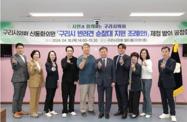 [한국뉴스타임=편집국] 구리시의회는 4월 18일 14시 의회 멀티룸에서 신동화 의원이 발의한 ‘구리시 반려견 순찰대 지원 조례’제정을 위한 공청회를 개최했다.