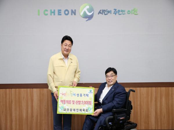 대한장애인체육회(회장 이명호)는 29일 이천시(시장 엄태준)에 아동 의류 및 신발 2천 여 점을 기탁했다.