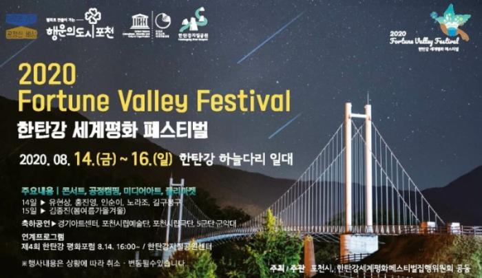 [한국뉴스타임=포천] 명기자= 포천시는 오는 8월 14~16일, 2박 3일 일정으로 한탄강 유네스코세계지질공원 하늘다리 일원에서 '2020 포춘밸리페스티벌 (프로젝트명: 한탄강 세계평화 페스티벌)을 개최한다.