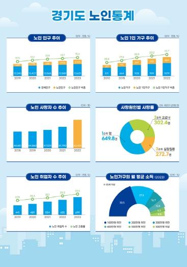 경기도는 2023년 기준으로 행정안전부의 주민등록인구 현황, 경기도의 사회조사 등 65세 이상 노인 관련 각종 통계자료를 분석한 ‘경기도 노인통계 2023’을 발간했다고 24일 밝혔다.