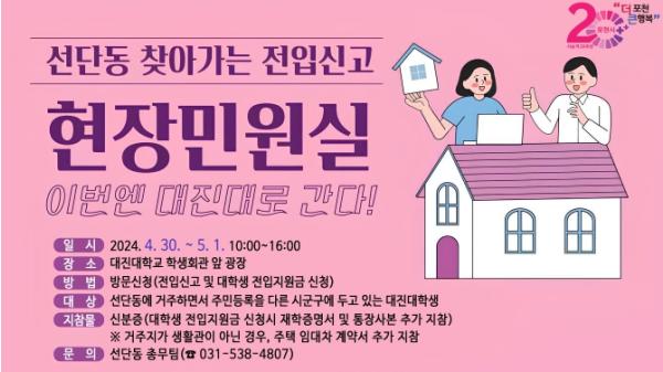 [한국뉴스타임=편집국] 포천시 선단동 행정복지센터는 오는 4월 30일부터 5월 1일까지 선단동 소재 대진대학교 학생회관 앞 광장에서 ‘찾아가는 전입신고 현장민원실’을 운영한다.