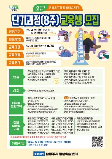 [한국뉴스타임=편집국] 남양주시는 오는 25일부터 5월 7일까지 2024년 2분기 평생학습센터 강좌 37개를 개설하고, 교육생 502명을 모집한다고 밝혔다.