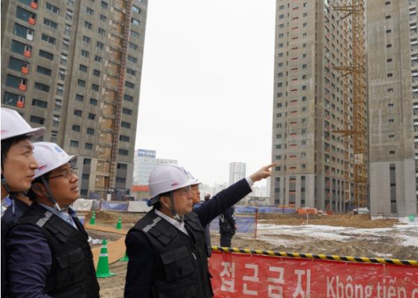 안양냉천지구 주거환경개선사업은 외국인 근로자 포함 약 900명의 근로자가 근무하는 건설현장으로써 GH 김세용 사장은 직접 건설현장을 방문하여 ▲ 근로자 안전장비 ▲ 근로자 관리실태 ▲ 외국인 근로자 안전교육 등 근로자 안전을 중심으로 점검했다.