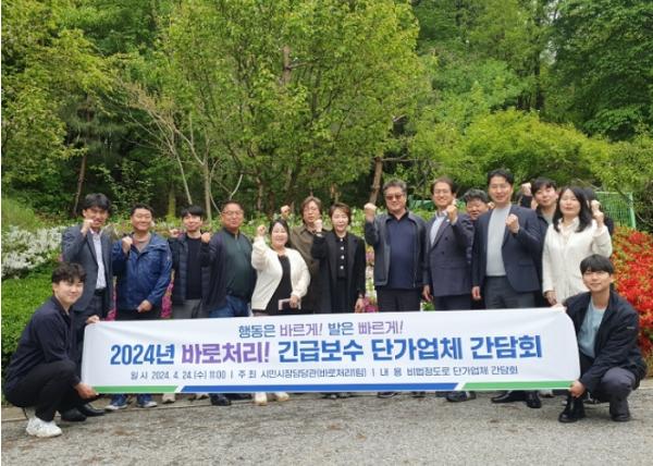 이번 간담회는 단가 업체 대표 및 현장관계자, 시 관계자 등이 참석한 가운데 △올해 바로처리 운영 방향 △비법정도로 긴급보수 시 유의사항 △현장 산업재해예방 안전교육 △건의사항 청취 순으로 진행됐다.