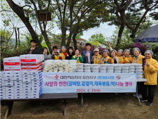 이날 대한적십자사 관인봉사회 회원 및 관계자 11여 명은 갈비탕, 겉절이, 제육볶음, 떡 등 반찬을 직접 만들고 포장하는 등 나눔에 나섰다.