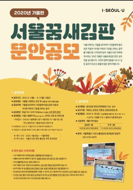 이번 공모 주제는 2020년 가을을 맞이하여, 풍요로운 마음과 넉넉한 여유의 기운을 전하는 문안을 응모하면 된다. 한글 30글자 이내의 시민 창작 글귀로, 1인당 총 2작품까지 가능하며 각각의 작품은 개별 접수해야 한다.