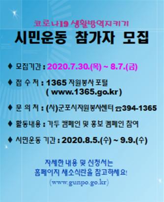 이번 캠페인은 코로나19 극복을 위한 군포시 민관협력기구인 ‘군포시민행동’ 주관으로 8월 5일부터 9월 9일까지 매주 수요일 산본역 중심상가와 금정역 먹자골목, 군포역 일원 등 유동인구가 많은 지역에서 실시될 예정이다.