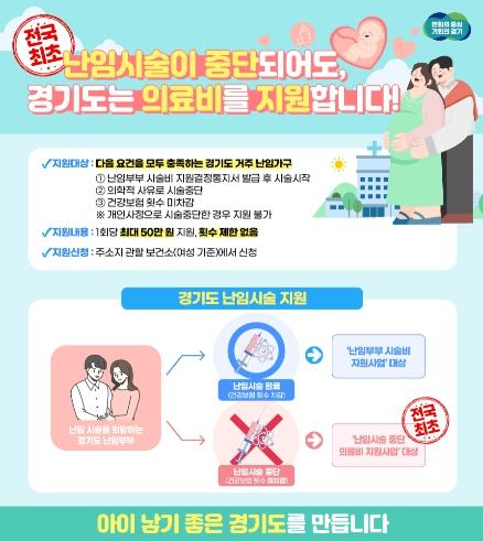 한편 경기도는 도민이 체감할 수 있는 인구, 저출생 정책 마련을 위해 경기도 ‘러브아이 프로젝트’를 시작한다. 이번 난임시술 중단 시 의료비 지원도 ‘러브아이 프로젝트’의 하나다. ‘러브아이’는 나(I)와 아이(Baby)를 사랑한다는 중의적 표현으로 경기도 저출생 정책 브랜드다.