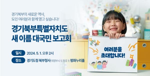 경기도는 5월 1일 오후 2시 경기도청 북부청사 평화누리홀에서 경기북부특별자치도의 새 이름을 알리고 축하하는 ‘대국민 보고회’를 연다고 30일 밝혔다.