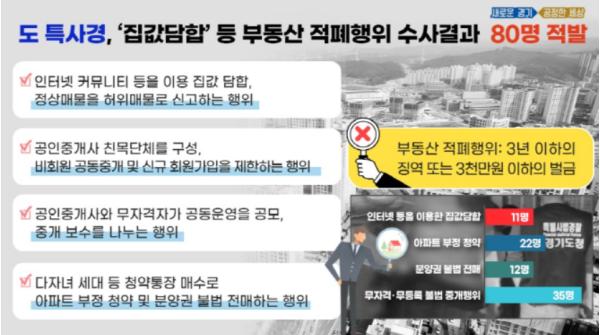 [KNT한국뉴스타임] 급매로 시세보다 싸게 나온 정상매물을 실거주자들이 담합해 허위매물로 신고하여 정상적인 중개행위를 방해하거나, 자격증이 없는데도 중개행위를 하는 등 부동산거래 질서를 교란시킨 불법행위자 80명이 경기도 수사에 대거 적발됐다.