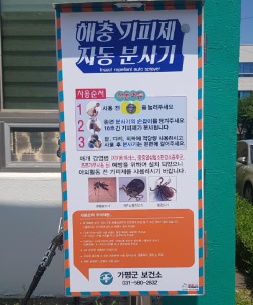 보건소 관계자는 "가평군보건소, 설악면보건지소, 청평면보건지소, 북면보건지소, 조종면보건지소, 율길리보건진료소, 임초리보건진료소, 하색2리마을회관에 누구나 사용할 수 있는 해충기피제분사기를 설치하였으며 기피제 용기에도 담아 갈 수 있으므로, 기피제 사용으로 진드기 매개 감염병 예방에 도움이 되길 바란다."고 밝혔다.