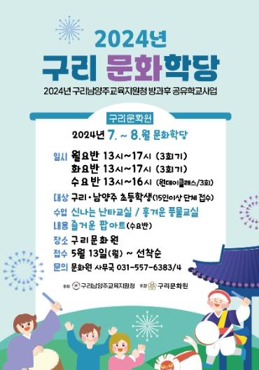 ‘2024년 구리문화학당’은 초등학생 여름방학 기간에 맞춰 진행될 예정이며, 프로그램 접수는 구리문화원 홈페이지와 이메일을 통해서 오는 5월 13일부터 선착순으로 진행된다.