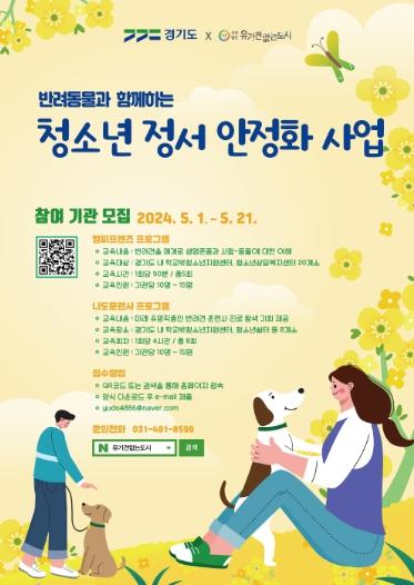 [한국뉴스타임=편집국] 경기도는 올해 '반려동물과 함께하는 청소년 정서안정화 사업'을 추진하기로 하고 참여 기관을 21일까지 모집한다.