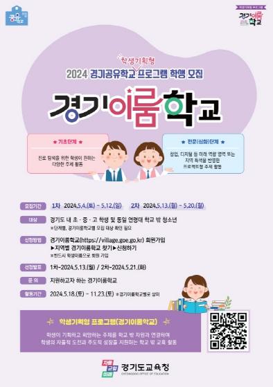 [한국뉴스타임=편집국] 경기도교육청이 5월 4일부터 20일까지 ‘2024 학생기획형 프로그램(경기이룸학교)’ 참여 학생을?모집한다.