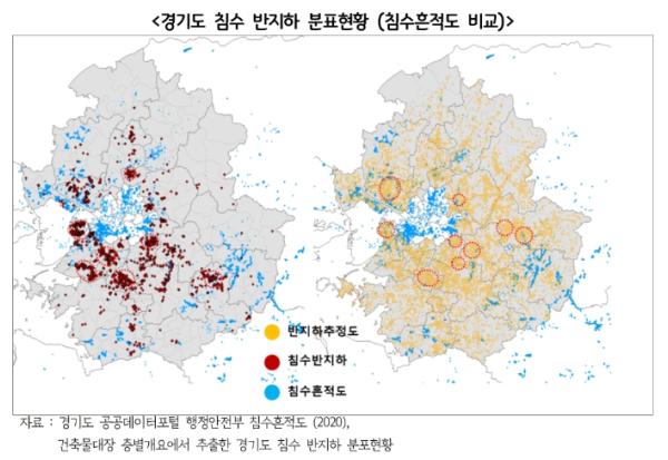경기도 침수 우려 지하 주택(우선 조사대상)은 현장 조사 집계표(2022년 12월까지 재난지원금 및 풍수해보험금 지급 가구 기반 침수 재해가 있었던 가구)에 따르면, 반지하주택 중 침수 반지하주택 개수는 8,861건(6.5%)에 해당하는 것으로 나타났다. 이를 경기도 공공데이터포털 행정안전부 침수 흔적(2020년)과 경기도 침수 반지하 분포 현황(건축물대장 층별개요 추출)을 비교해 보면 반지하 밀집 지역 분포와 침수 재해 반지하의 분포도가 일치하지 않는 것으로 나타났다. 이에 반지하주택의 전체적 대응보다는 우선적으로 인명사고가 발생하는 침수반지하 전수에 대한 대안 마련이 시급하다는 점을 꼽았다.