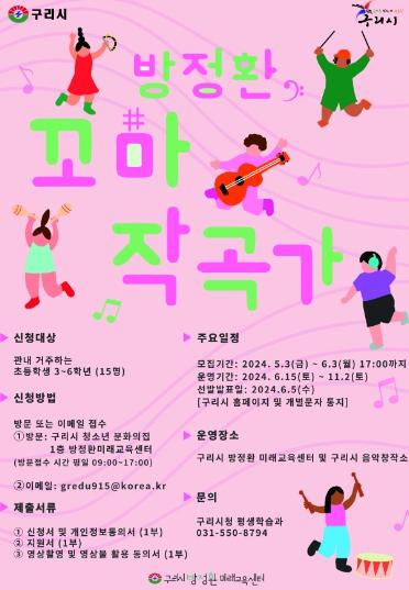 [한국뉴스타임=편집국] 구리시는 방정환 미래교육센터 운영하는 ‘방정환 꼬마작곡가’ 프로그램에 참여할 어린이를 5월 3일부터 6월 3일까지 모집한다.