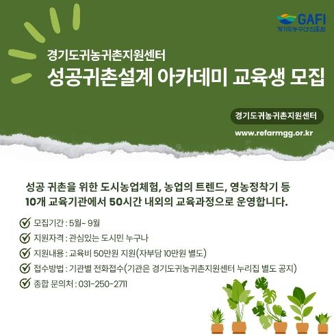 [한국뉴스타임=편집국] 경기도와 경기도농수산진흥원이 운영하는 경기도귀농귀촌지원센터가 5월부터 ‘2024 성공귀촌설계 아카데미’ 참여 교육생을 모집한다고 3일 밝혔다.