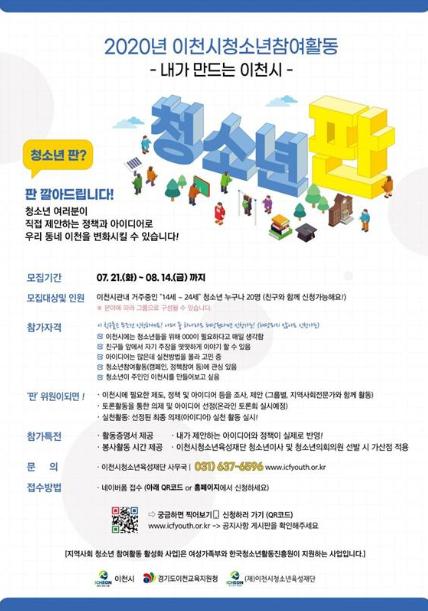 청소년판 모집기간은 8월 14일까지며, 이천시 관내 거주중인 14세~24세의 청소년 중 청소년 참여활동에 관심이 있는 누구나 참여할 수 있다.