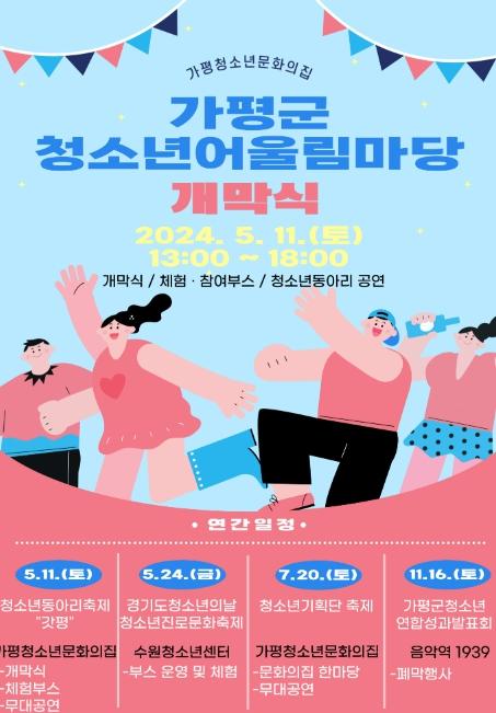 올해 주요 어울림마당 행사는 5월 개막식 및 경기도청소년의날 행사 참여, 7월 기획단 축제, 11월 가평군연합축제 등 총 4번의 축제로 운영될 예정이다.