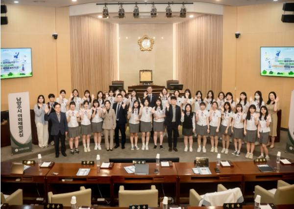 이날 학생들은 의회 청사를 견학한 뒤 본회의장에서‘기후변화에 대처하는 남양주시의 지속가능한 발전 방향’을 주제로 의장, 의원, 사무국장 등 역할을 나눠 회의를 진행하며 지방의회의 의사결정과정을 직접 체험했다.