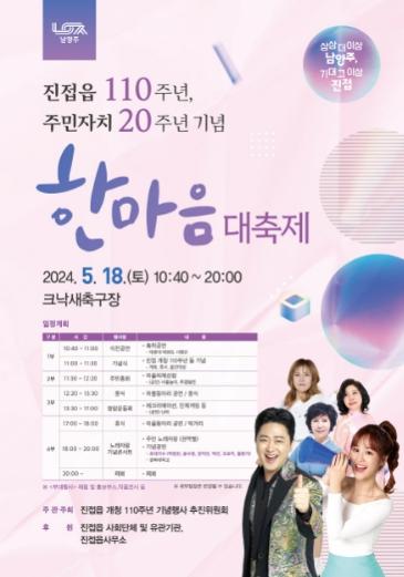 한마음 대축제는 오는 18일 오전 10시 40분부터 오후 8시까지 총 4부로 진행되며 특히 올해는 진접읍이‘진접’으로 개청(1914년)된 지 110주년, 주민자치를 시작(2004년)한 지 20주년이 되는 해로 더욱 뜻깊은 행사가 될 예정이다.