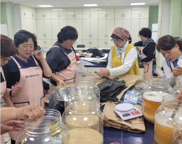 이번 과제연찬 교육에서 한국생활개선포천시엽합회 회원들은 샐러드 드레싱, 다양한 무침 요리, 여름철 비빔국수, 냉국 등 다양한 요리에 활용할 수 있는 만능 청인 다시마 청을 만들었다.