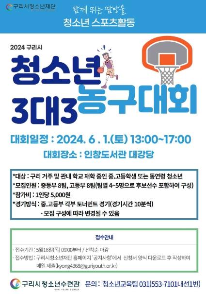 [한국뉴스타임=편집국] 구리시청소년재단 청소년수련관은 청소년스포츠 활동 활성화와 건전한 여가 체육활동 참여 기회를 확대하고자 오는 6월 1일 인창도서관 대강당에서 ‘2024 구리시 청소년 3대3 농구대회’를 개최한다.