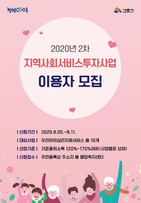 시흥시(시장 임병택)는 2020년도 2차 지역사회서비스투자사업 바우처 이용자를 이달 5일부터 11일까지 5일간 모집한다.