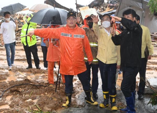 [KNT한국뉴스타임] 이용철 경기도 행정2부지사는 4일 오전 정정화 가평부군수, 김전수 가평소방서장 등 관계자들과 함께 집중호우로 인한 가평 펜션 매몰사고 현장을 방문했다.