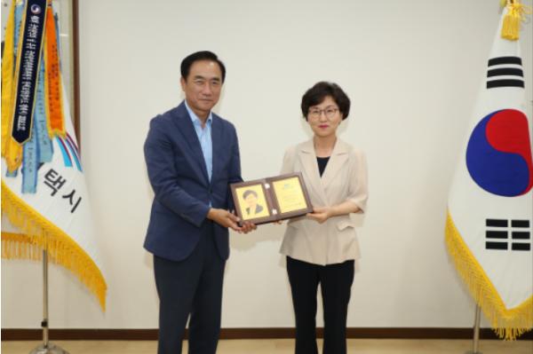 [KNT한국뉴스타임] 평택시는 올 해 5번째 평택명예시민으로 이화순 경기도사회서비스원장을 선정하고 8월 3일 명예시민증과 명예시민패를 수여했다.