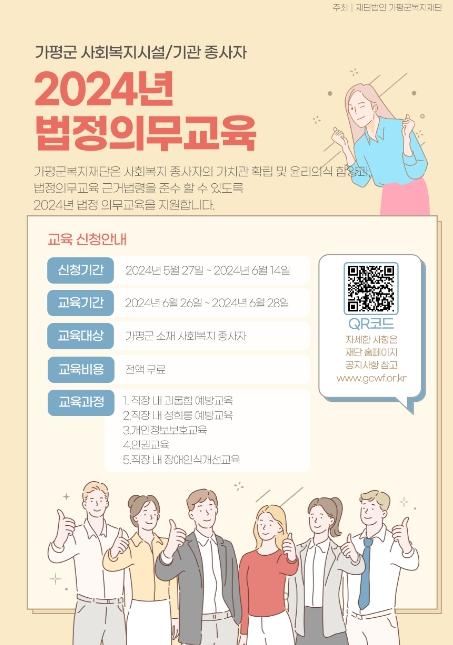 [한국뉴스타임=편집국] 가평군복지재단은 사회복지 종사자를 대상으로 법정의무교육을 오는 6월 26일부터 28일까지 청평도서관 어울림실에서 실시한다고 밝혔다.
