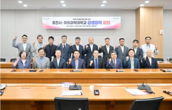 [한국뉴스타임=편집국] 포천시는 지난 17일 포천시청 시정회의실에서 차원태 차의과학대학교 총장을 비롯한 30명의 관계자가 참석한 가운데, 포천시와 차의과학대학교의 상생발전을 위한 회의를 개최했다.