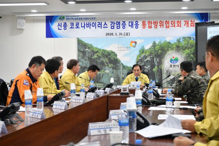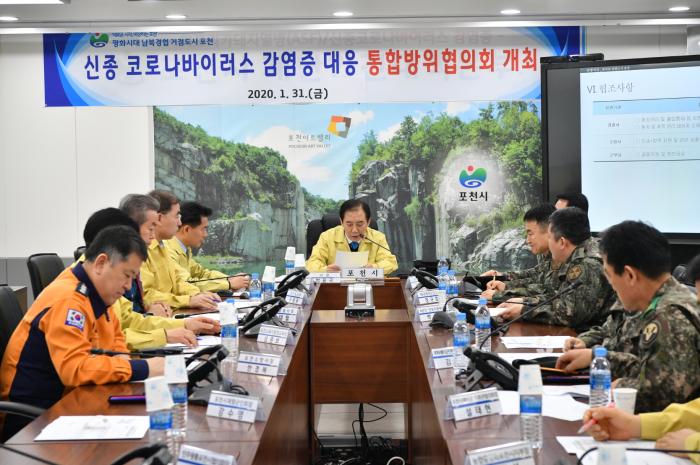 포천시(시장 박윤국)는 지난 31일 신종 코로나바이러스 감염증 위기경보가 『경계』단계로 격상됨에 따라 지역사회 확산 가능성에 대비하고 피해를 사전에 예방하고자 시 재난안전상황실에서 신종 코로나바이러스 감염증 총력 대응을 위한 통합방위협의회 지역회의를 개최했다.