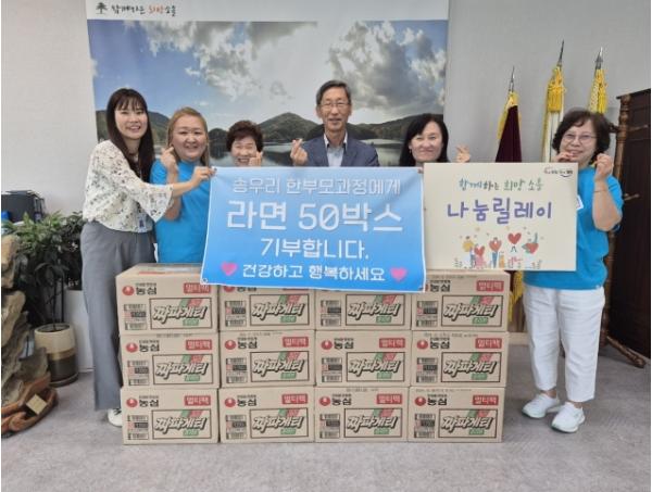 [한국뉴스타임=편집국] 소흘읍 행정복지센터는 지난 25일 이동교리 소재 카페 ‘웅이나무’에서 소흘읍 저소득층 한부모가정을 위한 90만 원 상당의 짜장라면 50박스를 기탁했다고 밝혔다.